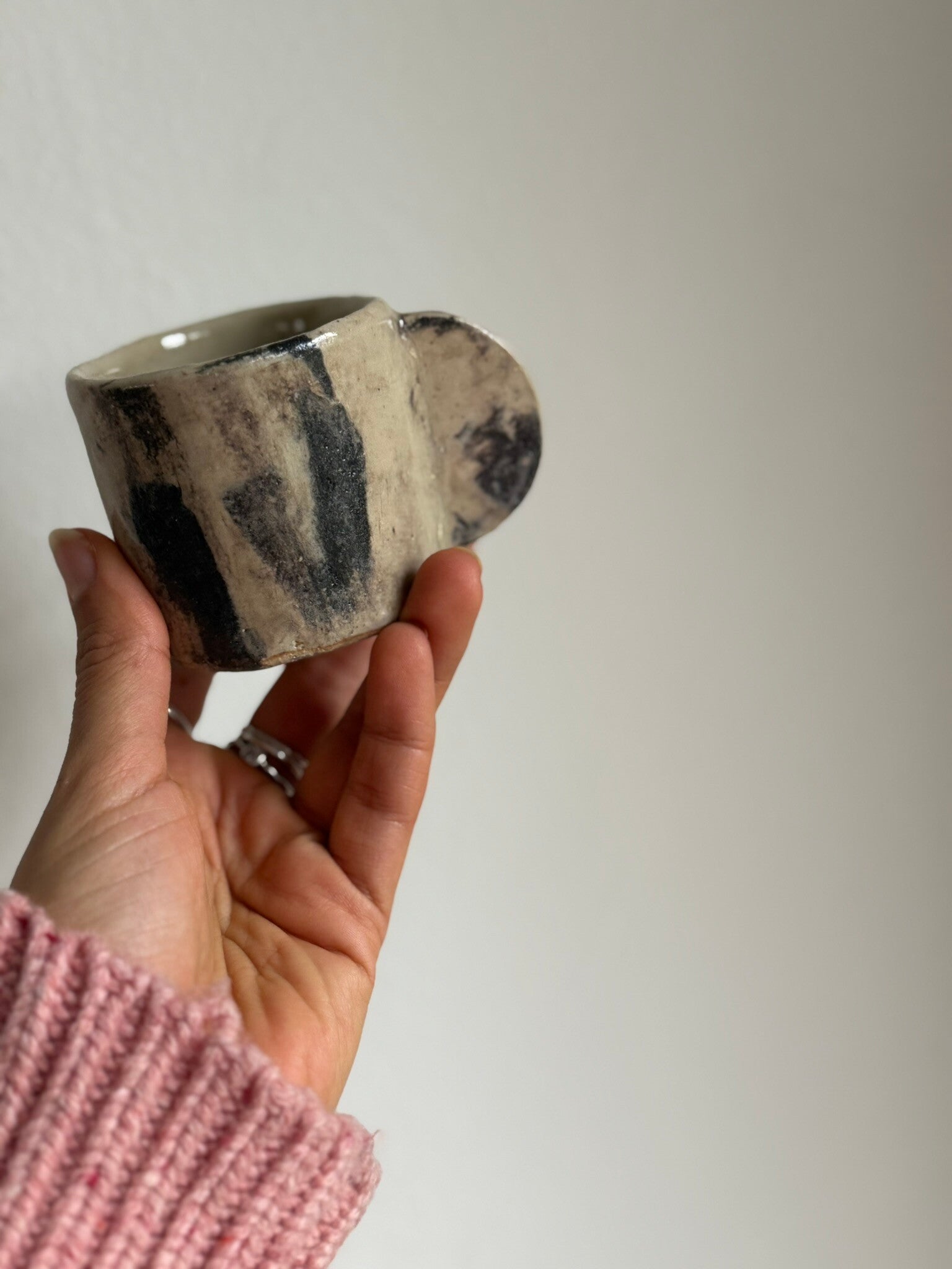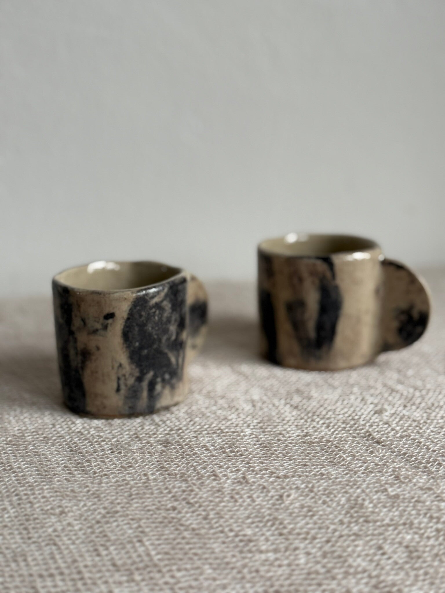 The cups are finished with a fully transparent glaze, providing a beautiful gloss and a smooth finish while keeping the natural tones and marbling of the mixed clay crisp and clear. Featuring a delicate small handle, they are designed to fit perfectly in your hand for a powerful shot of espresso.