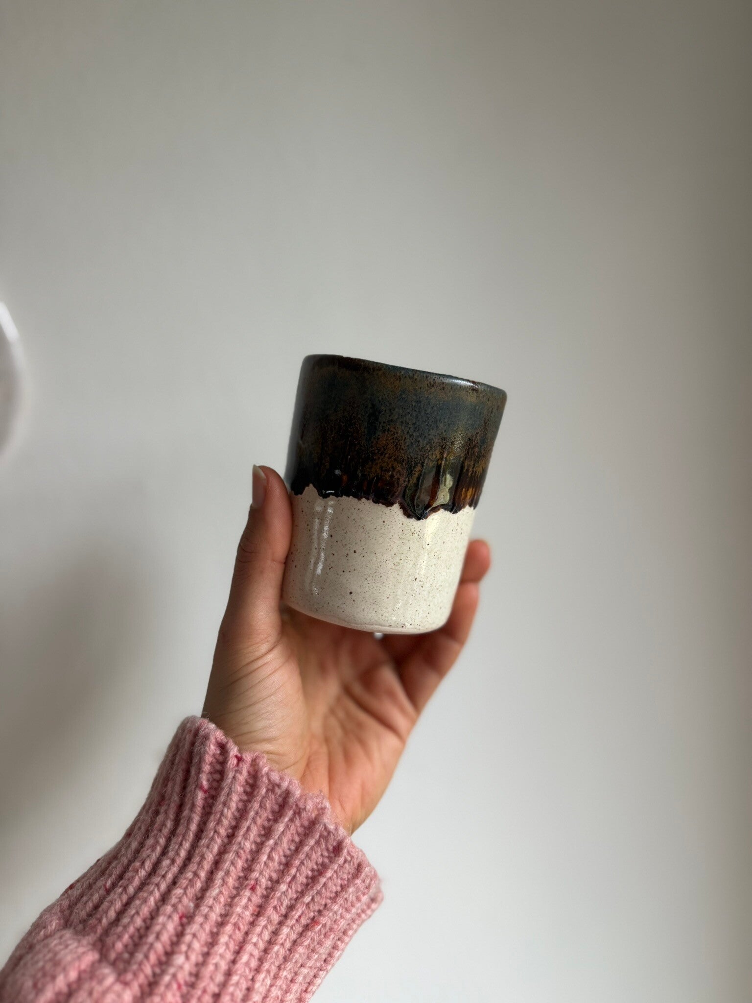 The cups feature a serene, rounded shape that sits comfortably in your hand. The contrast between the layered glazes turns each piece into a small landscape of its own, showcasing how liquid glaze finds its own path in the heat of the kiln. This process gives every item a unique and characteristic soul.