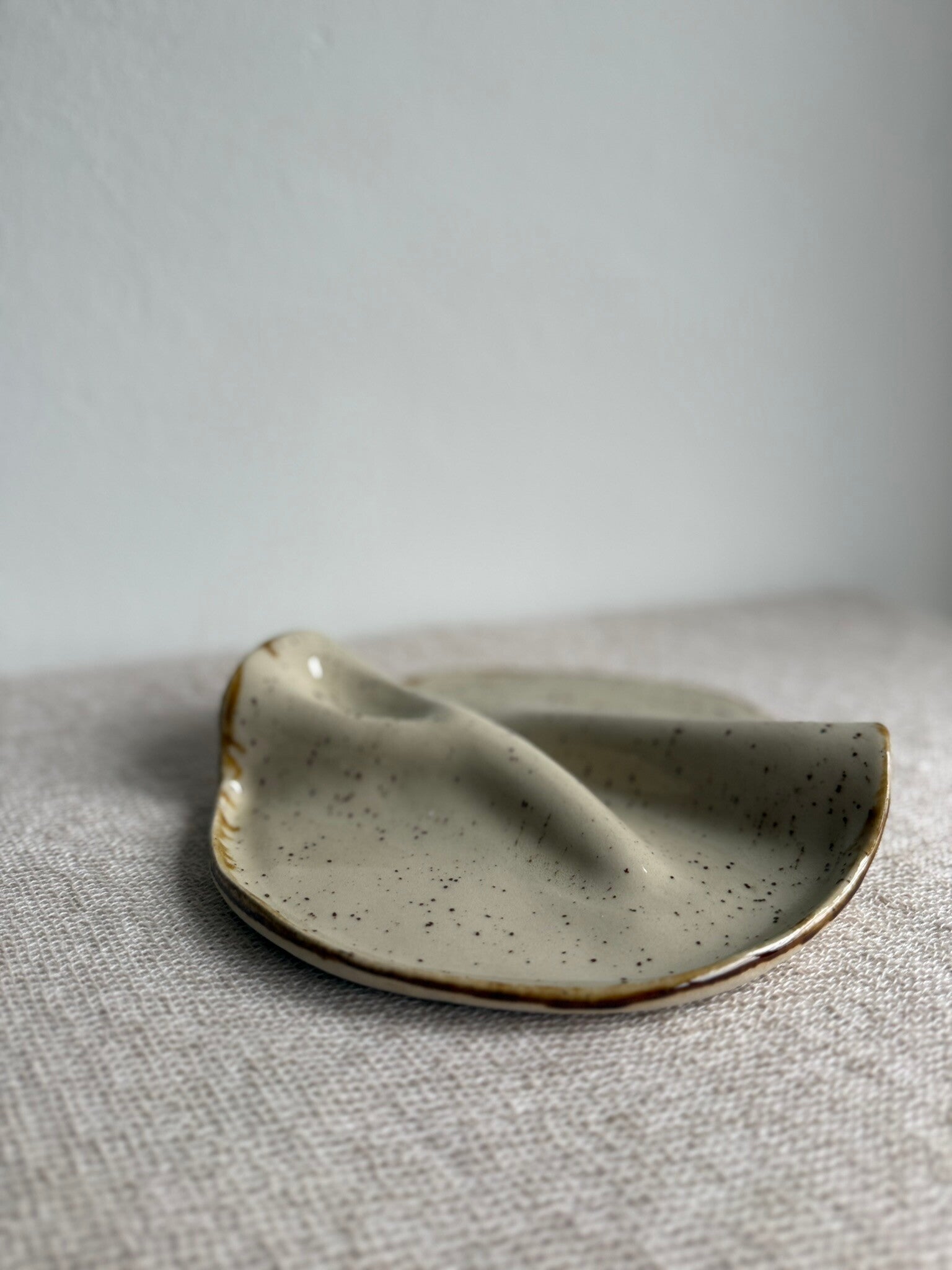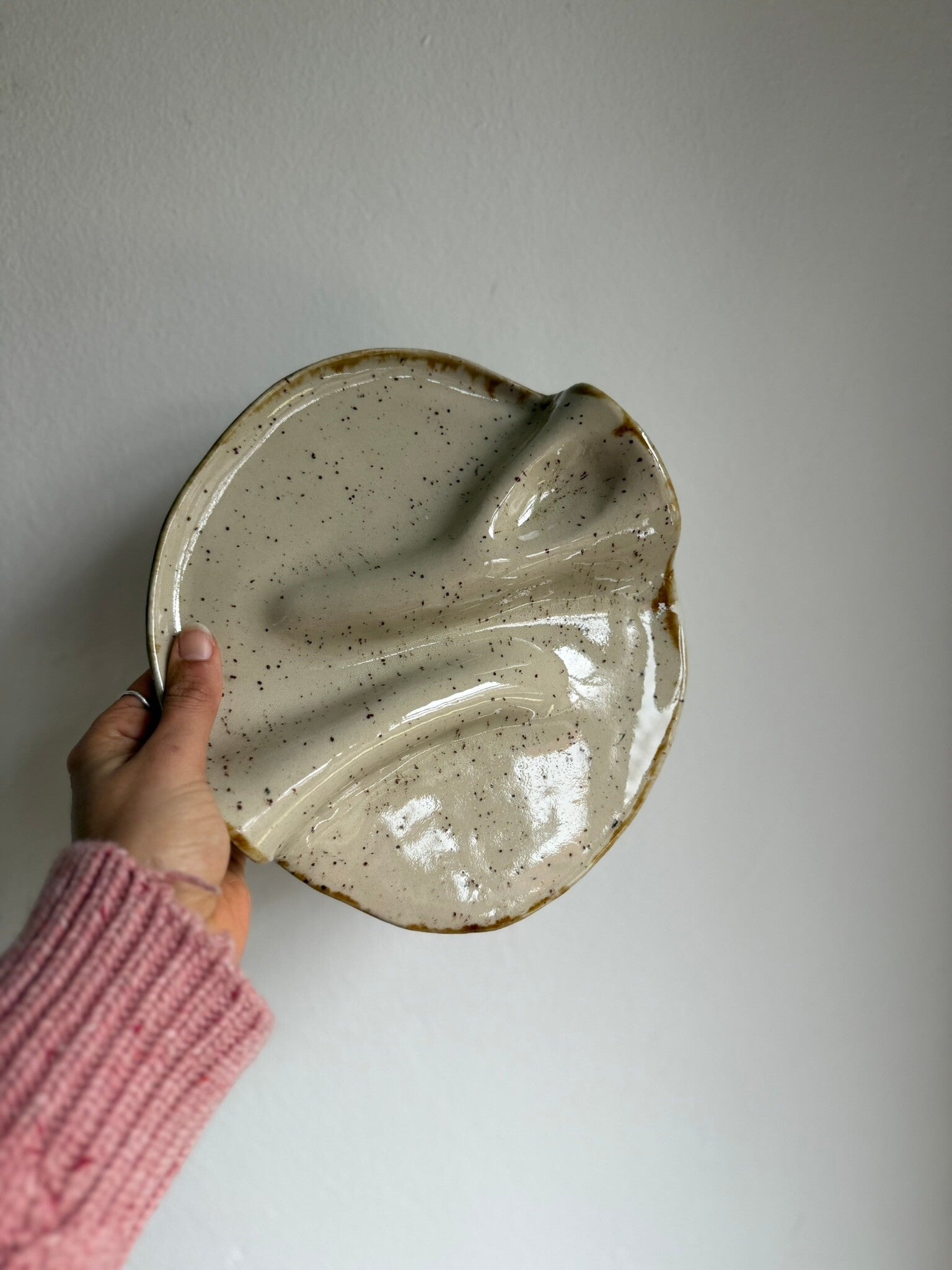 An eye-catcher with a playful character. This large plate is characterized by its deep form and a distinct wavy rim. The cream glaze is enriched with subtle speckles that add extra depth to the handcrafted piece. A powerful statement piece for a beautifully set table.