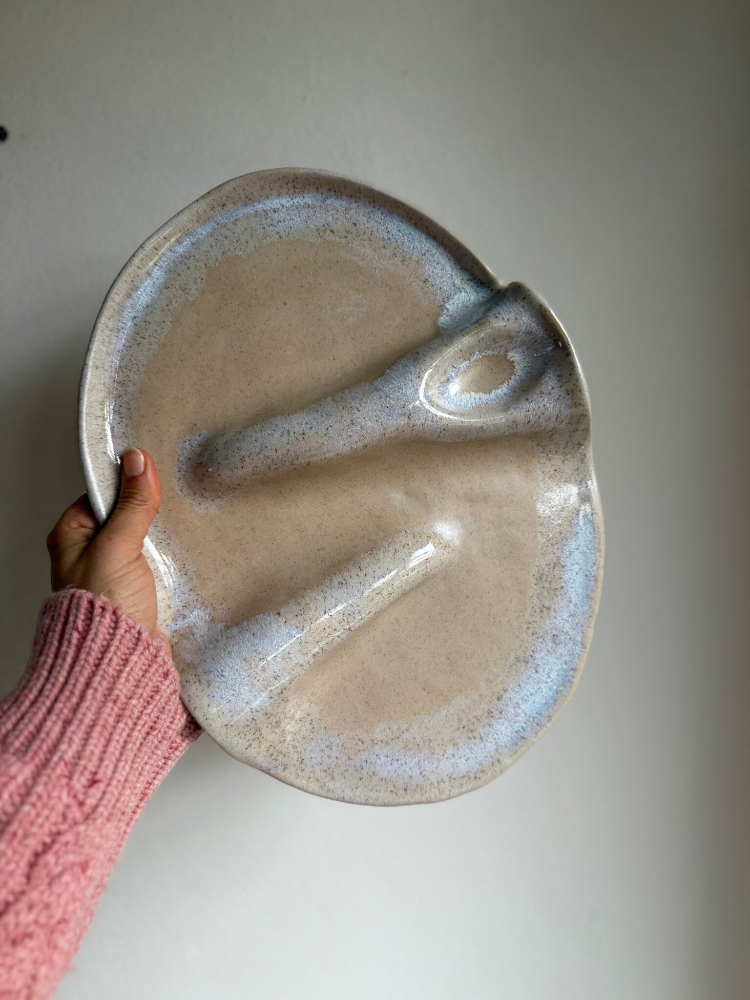 An impressive centerpiece for your table. This extra-large Wavy Plate stands out with its generous size and characteristic, deep wavy rim, carefully shaped by hand. The glaze features a stunning artistic gradient where deep blue and cream tones seamlessly blend into one another. A functional piece of art that elevates any appetizer presentation and makes a powerful statement, whether filled or displayed on its own.