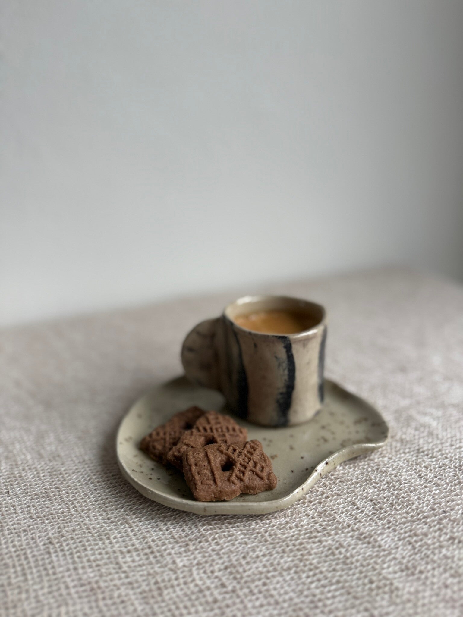 A subtle and practical small plate that shines in its simplicity. The cream glaze is dotted with fine speckles, giving the handcrafted piece a lively and artisanal character. A versatile item that brings serenity to the table, whether used as a saucer under a mug or for the stylish presentation of something small.