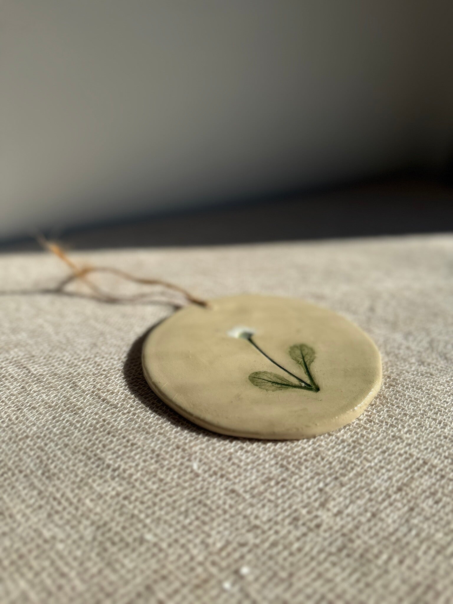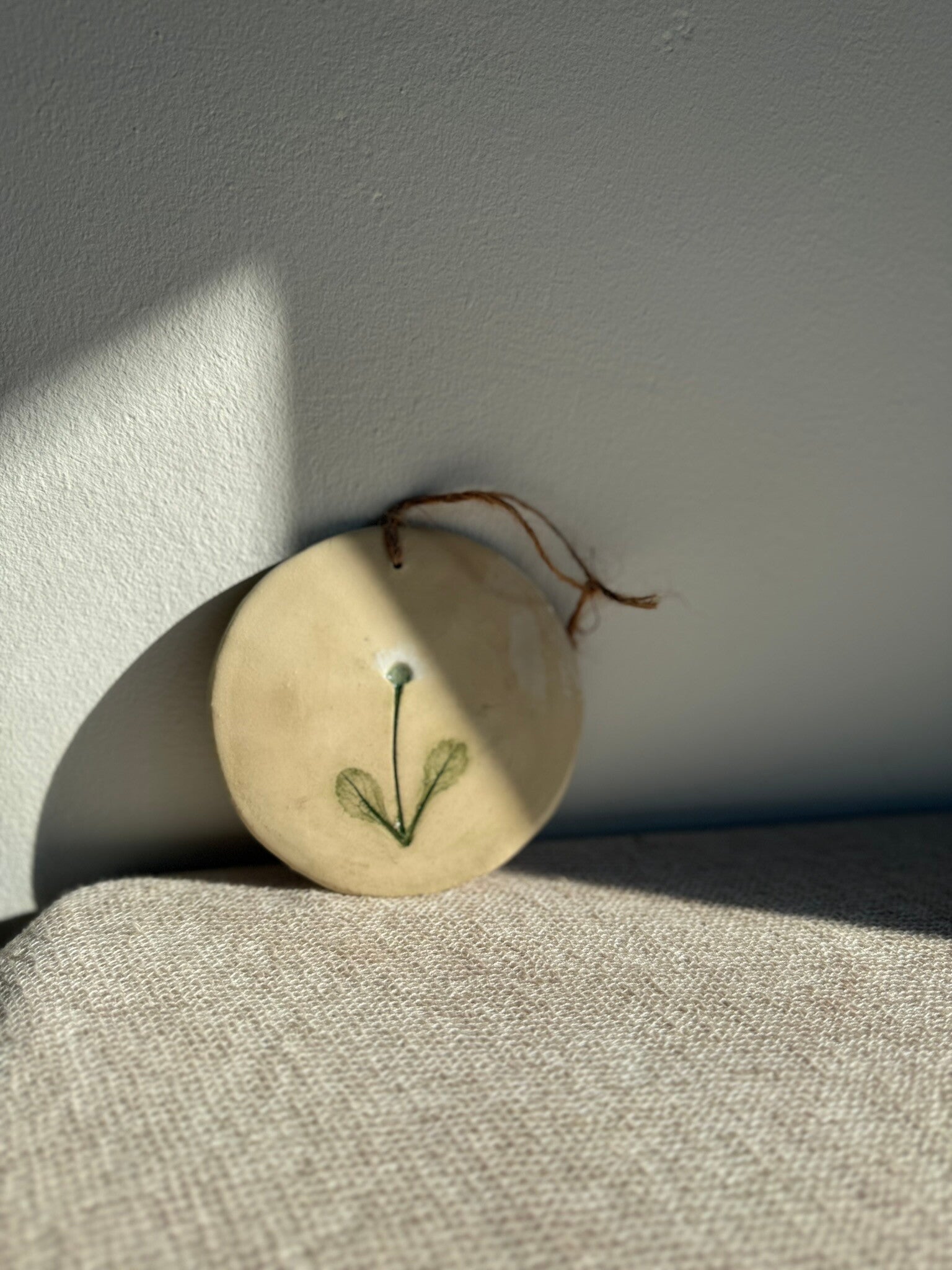 Finished in a serene, silky "Pure Cream" glaze, the disc highlights the organic texture of the plant against a minimalist backdrop. Strung on a simple piece of twine, it serves as a poetic wall accent. A small, handcrafted sanctuary that brings the quiet beauty of the outdoors into your home.