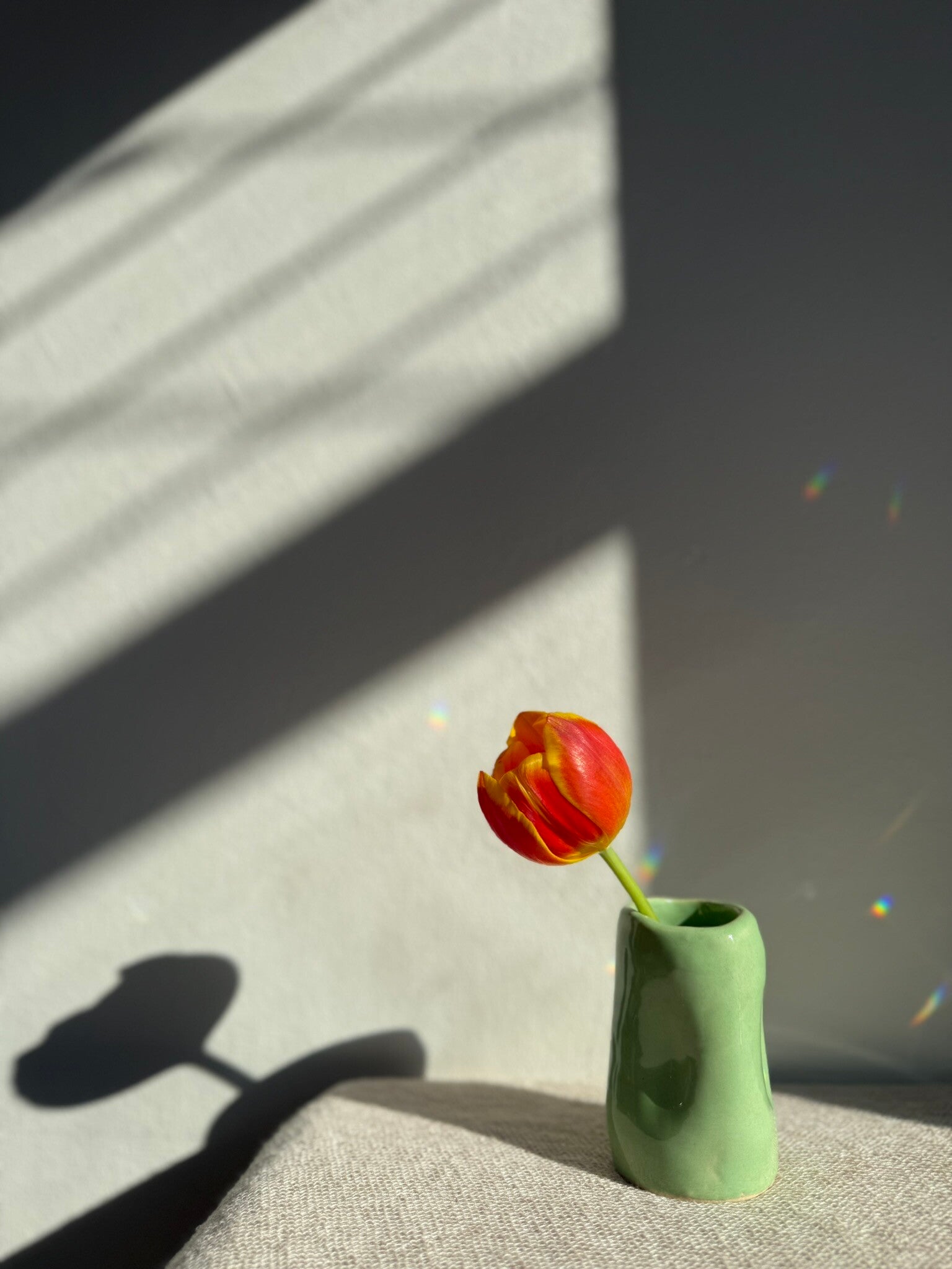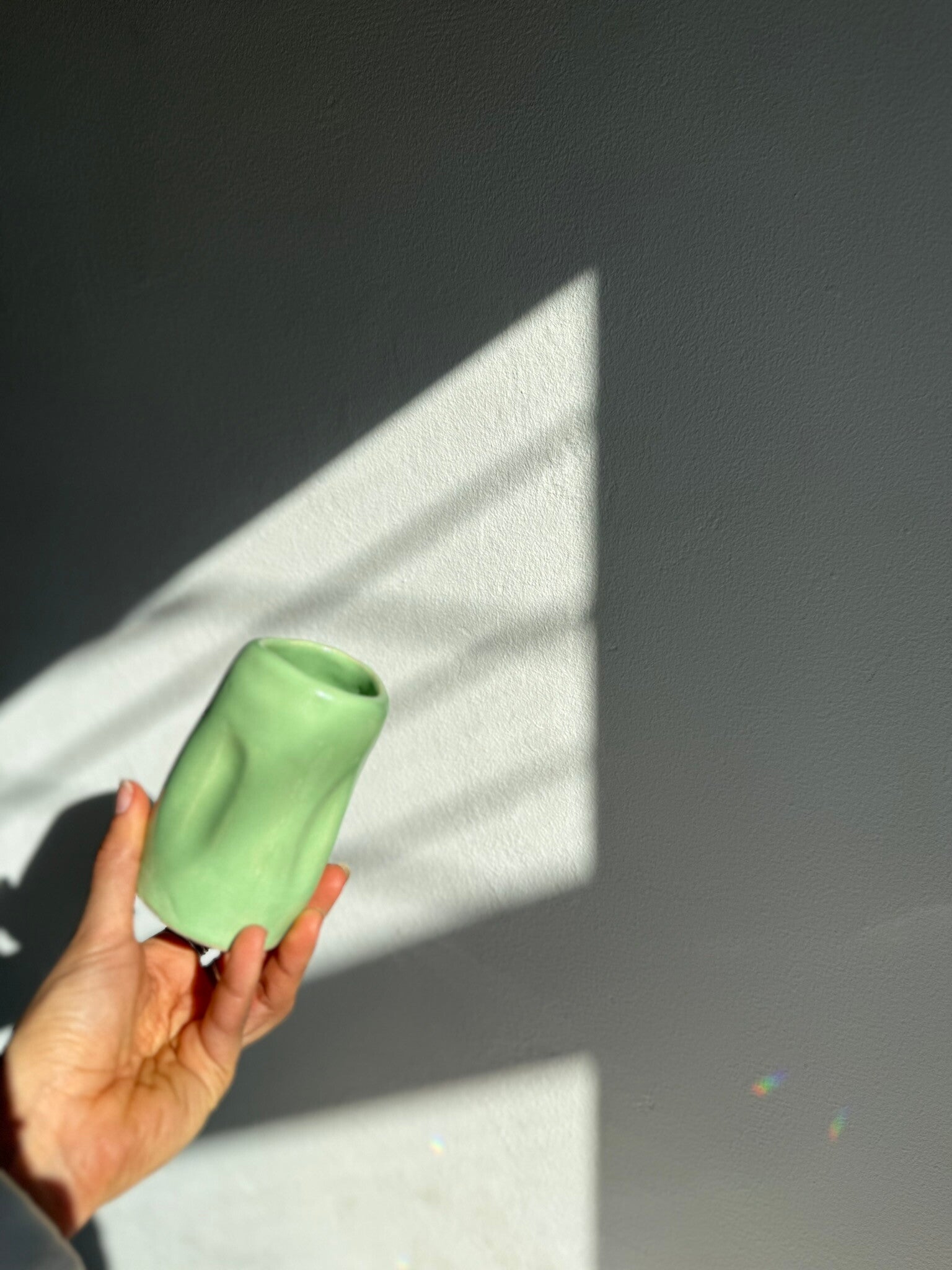 A fresh, hand-formed eye-catcher in a soft pale green glaze. The hand-pressed dimples all around give this vase a playful, tactile character that catches the light from every angle. It’s the perfect match for a few fresh flowers or a single branch.